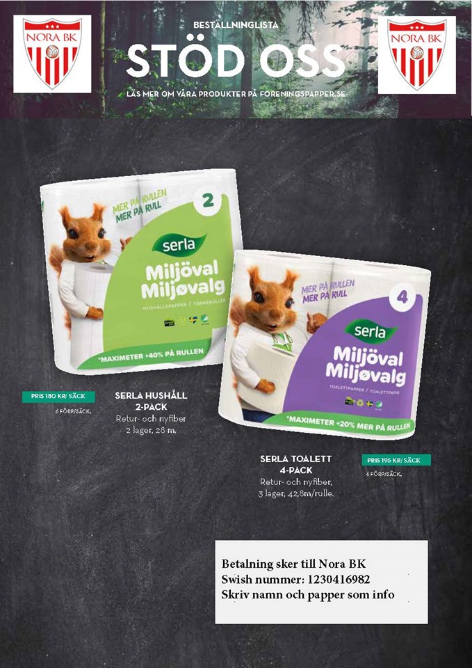Nora BK kommer sälja toa & hushållspapper med start om ca 10 dagar, föreningen tjänar lite pengar, men vi hjälper även till att förse alla Norabor med papper nu när det blivit bristvara i affärerna. Dubbelt bra. Varje lag skall sälja 2 säckar per spelare, och laget hjälps åt. Preliminärt så kommer utlämning ske lördag den 4 april, mellan 9-11 vid Nyttorpsindustriområde, Nyttorpsvägen 9 bredvid biltvätten. Vi kommer även lämna ut bricketter för försäljning. Mer info kommer.