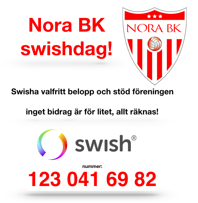 Under lördagen så genomfördes en Swishdag för att samla in pengar till klubben. Nora BK är absolut ingen klubb i kris på något sätt, det vill vi förtydliga. Men som ni säkert vet så är varje krona viktig för en förening. Och vi kan glädjande redovisa att Swish-dagen gav ca 7600 kr in till föreningen. Ett stort tack till alla er som var med och stöttade oss! Tillsammans är vi Nora BK! Missade du Swishdagen? Ingen fara i så fall, för genom att verktyg som Laget.se tagit fram så finns möjligheten att när du vill stötta din lokala förening ekonomiskt. Det är en insamling som kommer ligga rullandes på vår hemsida under hela säsongen. Klicka in HÄR för att läsa mer och lämna ditt bidrag. Återigen, stort tack till alla som stöttar oss i vått och torrt!