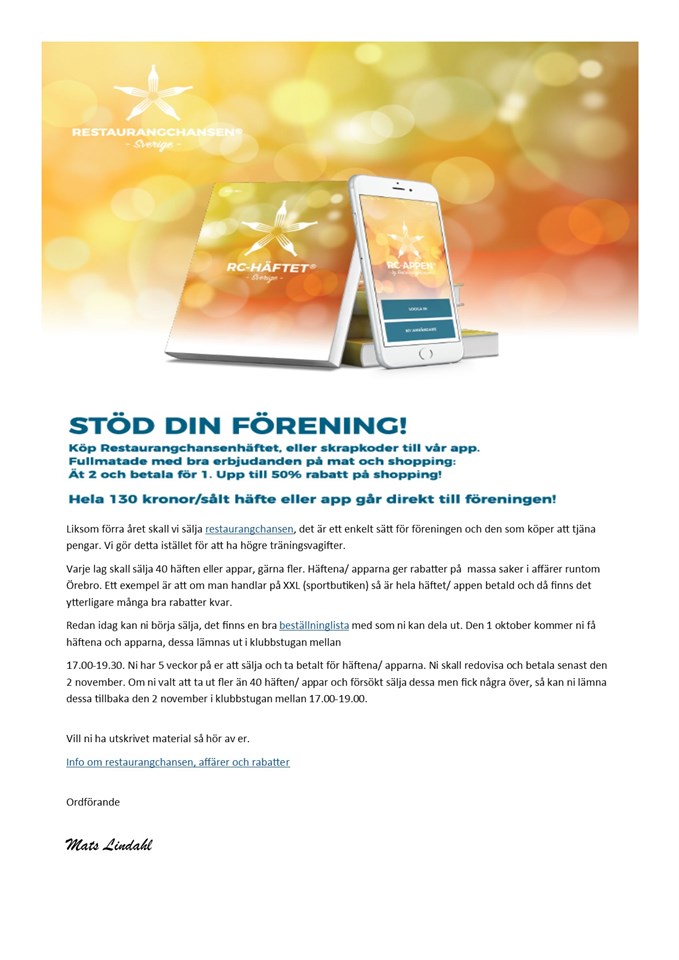 Liksom förra året skall vi sälja restaurangchansen, det är ett enkelt sätt för föreningen och den som köper att tjäna pengar. Vi gör detta istället för att ha högre träningsvagifter. Varje lag skall sälja 40 häften eller appar, gärna fler. Häftena/ apparna ger rabatter på massa saker i affärer runtom Örebro. Ett exempel är att om man handlar på XXL (sportbutiken) så är hela häftet/ appen betald och då finns det ytterligare många bra rabatter kvar. Redan idag kan ni börja sälja, det finns en bra beställninglista med som ni kan dela ut. Den 1 oktober kommer ni få häftena och apparna, dessa lämnas ut i klubbstugan mellan 17.00-19.30. Ni har 5 veckor på er att sälja och ta betalt för häftena/ apparna. Ni skall redovisa och betala senast den 2 november. Om ni valt att ta ut fler än 40 häften/ appar och försökt sälja dessa men fick några över, så kan ni lämna dessa tillbaka den 2 november i klubbstugan mellan 17.00-19.00. Vill ni ha utskrivet material så hör av er. Info om restaurangchansen, affärer och rabatter Ordförande Mats Lindahl